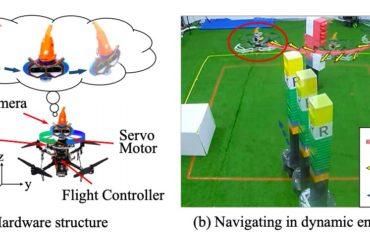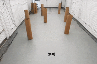 A small drone takes a test flight through a space filled with randomly placed cardboard cylinders acting as stand-ins for...