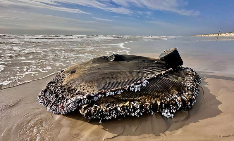 Drifting devices often get stranded in regions far away from tuna-fishing grounds. This one found on a beach in Texas was likely deployed off the coast of West Africa. © Jace Tunnell