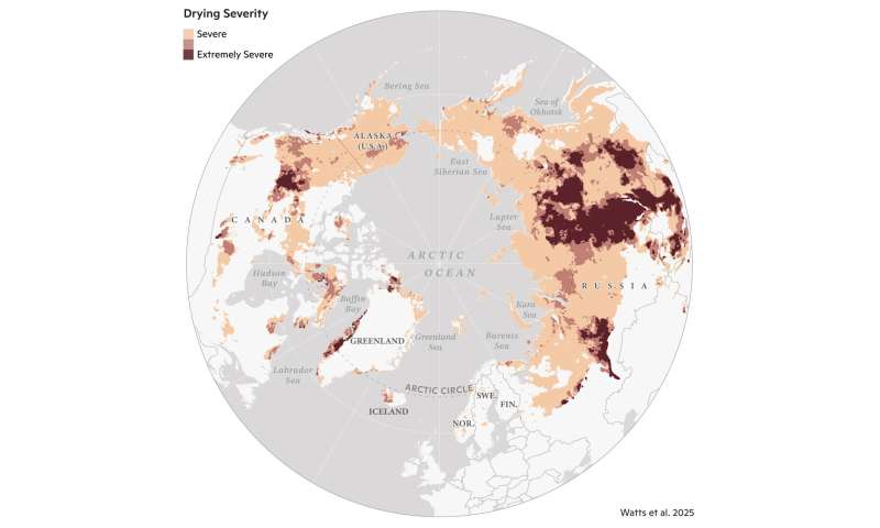 Map of areas of severe to extremely severe drying in the Arctic-boreal region. Drying severity was determined by analyzing multiple variables from the satellite record. Watts et al., 2025, Geophysical Research Letters. © Christina Shintani / Woodwell Climate Research Center