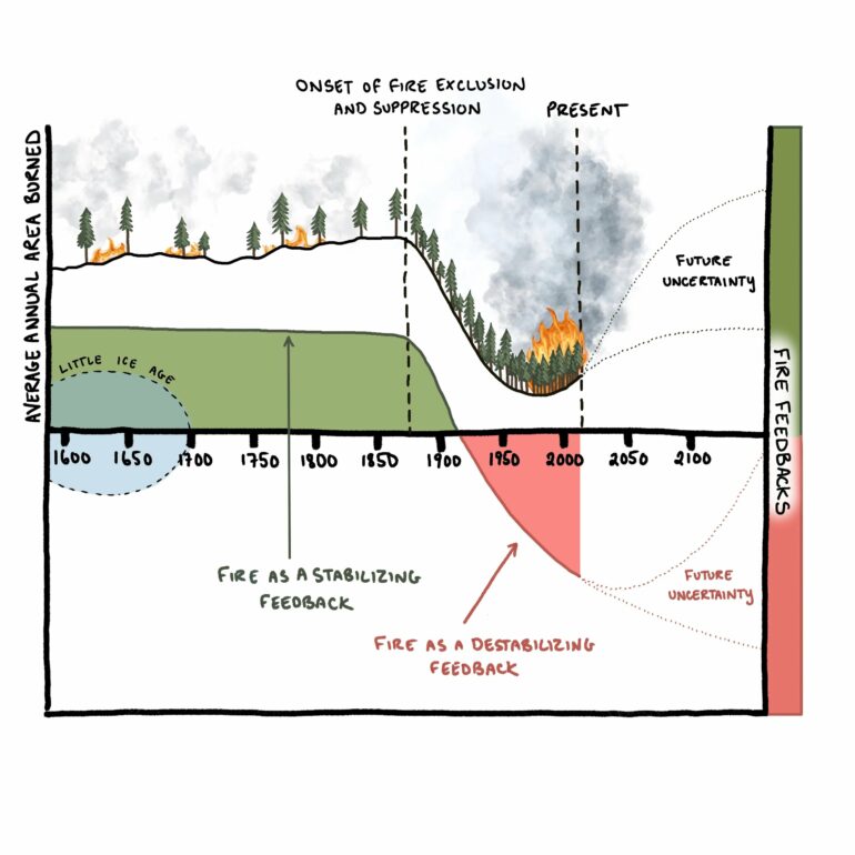 Before 1880, fires burned more frequently but less severely across many forests due to traditional burning practices by Indigenous peoples and lightning-sparked fires. These fires often had a stabilizing effect on the forests by clearing out brush and debris—lowering the amount of flammable forest fuels available.