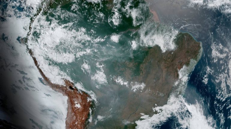 In satellite images of Mato Grosso, Brazil provided by satellite company Planet, taken on Aug. 20, smoke wafts above fragments of the rainforest interspersed with tan-colored squares of farmland, where the Amazon has already been deforested for agriculture.