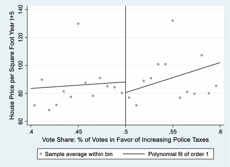 “Just intuitively, you’d think that police services would make a difference in house prices. And it just wasn’t there in the data,” he added, “until you split the sample.”