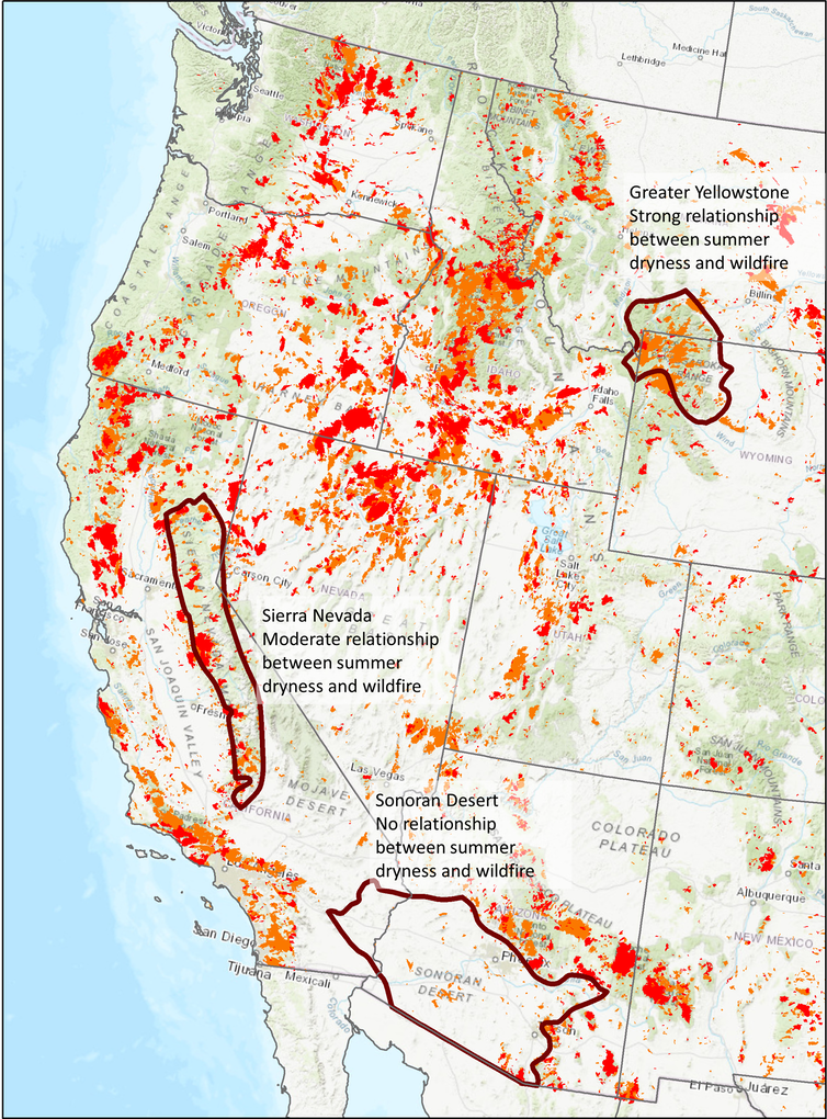 How hot and dry the climate is in an area influences the amount of fuel that is available to burn and the strength of the relationship between wildfire and climate. Ecologists such as us calculate how closely related wildfire area burned is to how hot and dry it is during the summer, and we have found that the relationship does indeed vary.