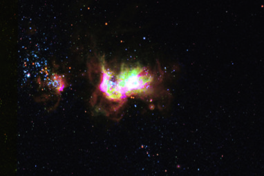 Two massive touching stars in a neighboring galaxy are on course to become black holes that will eventually crash together,...