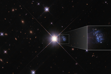 Peeking out from behind the glare of a bright foreground star, astronomers have uncovered the most extraordinary example yet of...