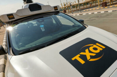 Mustafa sits motionless behind the wheel, upturned hands in his lap, as his taxi drives itself, bringing the United Arab...