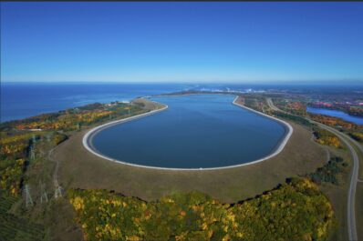 Sprawled like a gigantic swimming pool atop a bluff overlooking Lake Michigan is an asphalt-and-clay pond holding enough water to...